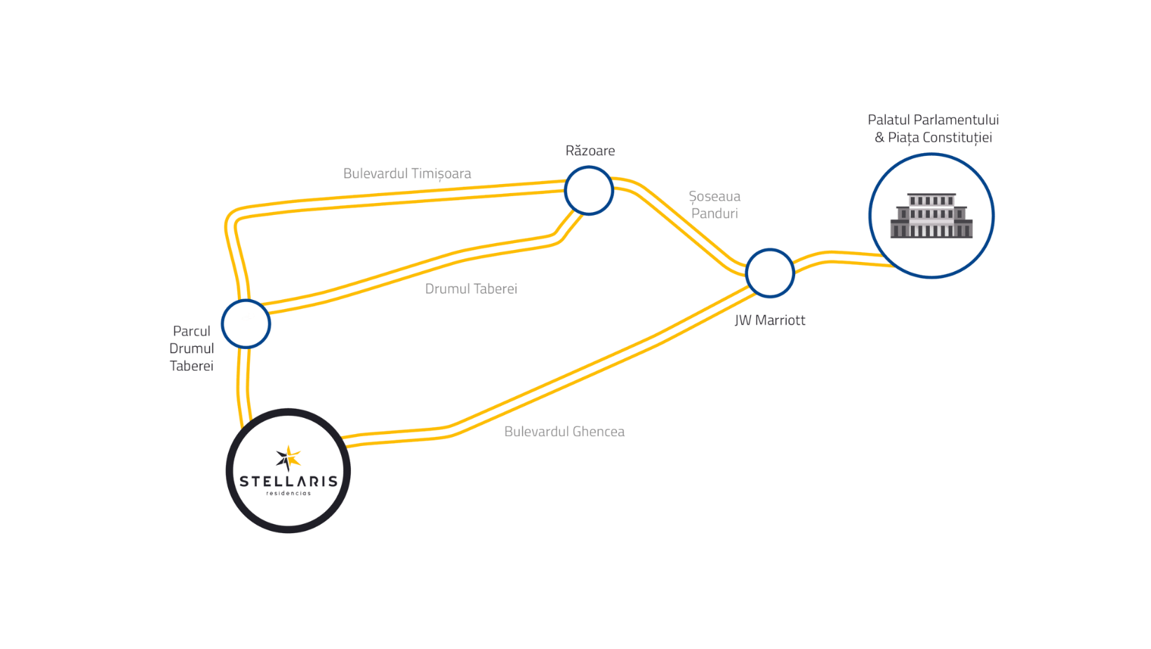 Situat la câteva minute distanta de Parcul Drumul Taberei, Stellaris Residencias te răsfață cu toate avantajele unui cartier modern și cosmopolit. Parcurile, școlile, grădinițele și marile centre comerciale sunt foarte ușor accesibile, printr-o simplă plimbare.